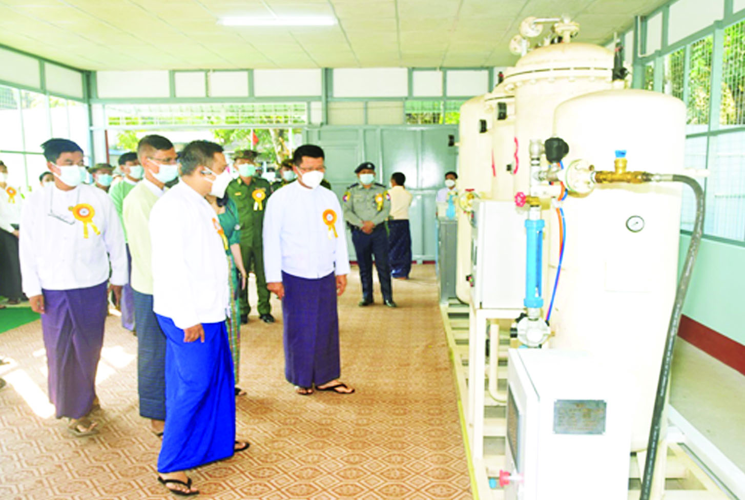 ဦးစွာ ဝန်ကြီးချုပ်၊  တိုင်းမှူး နှင့် တာဝန်ရှိသူများက အောက်ဆီ ဂျင်စက်ရုံဖွင့်ပွဲ   ဆိုင်းဘုတ်ကို ဖဲကြိုးဖြတ်       ဖွင့်လှစ်ပေးပြီး ကမ္ပည်းမော်ကွန်းကို အမွှေးနံ့သာ ရည်များ  ပက်ဖျန်းပေးပြီး စက်ရုံ လည်ပတ်မှု    အခြေအနေများကို လှည့်လည်ကြည့်ရှုသည်။(ဝဲပုံ)