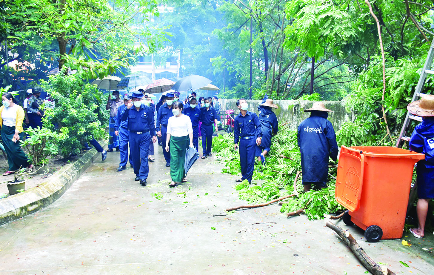 ထို့နောက် မြို့တော်ဝန်နှင့်အဖွဲ့သည် ကျောက် တံတားမြို့နယ် (၄) ရပ်ကွက် ပန်းဆိုးတန်းလမ်း အနောက်ဘက်ခြမ်း (ကမ်းနားလမ်းနှင့်ကုန်သည်လမ်းကြား) ပြည်တွင်းအခွန်များဦးစီးဌာနရှေ့ လမ်း တစ်လျှောက်၌လည်းကောင်း၊ တာမွေမြို့နယ် နတ် မောက်ရပ်ကွက် ကျိုက္ကဆံလမ်းနှင့် ဦးထွန်းမြတ် လမ်း လမ်းထောင့်ရှိ အမှတ် (၄) အခြေခံပညာ အထက်တန်းကျောင်း၌လည်းကောင်း၊ ရန်ကင်းမြို့ နယ် (၁၅)ရပ်ကွက် မိုးကောင်းလမ်း အခြေခံပညာ အလယ်တန်းကျောင်းခွဲ၊ အမှတ်(၁၁) အခြေခံပညာ မူလတန်းကျောင်း၌လည်းကောင်း၊ ဌာနဆိုင်ရာ ဝန်ထမ်းများ၊ လူမှုရေးအသင်းအဖွဲ့များ၊ စည်ပင် သာယာဝန်ထမ်းအင်အားဖြင့် အုပ်မိုးကိုင်းများ၊ မြက်ပင်ချုံနွယ်များ ခုတ်ထွင်ရှင်းလင်းခြင်း၊ သွေးလွန် တုပ်ကွေးရောဂါ ကာကွယ်နှိမ်နင်းရေးအတွက် စာသင်ခန်းများအတွင်း ခြင်ဆေးမှုတ်ခြင်းနှင့် အဘိတ်ဆေးခတ်ခြင်းလုပ်ငန်းများ ဆောင်ရွက်နေမှု တို့ကို ကြည့်ရှုစစ်ဆေးပြီး အုပ်မိုးကိုင်းများ ခုတ်၍ အလင်းဖွင့် ပုံသွင်းရန်တို့ကို မှာကြာပြီး လိုအပ် သည်များ ဖြည့်ဆည်းဆောင်ရွက်ပေးခဲ့ကြောင်း သိရသည်။