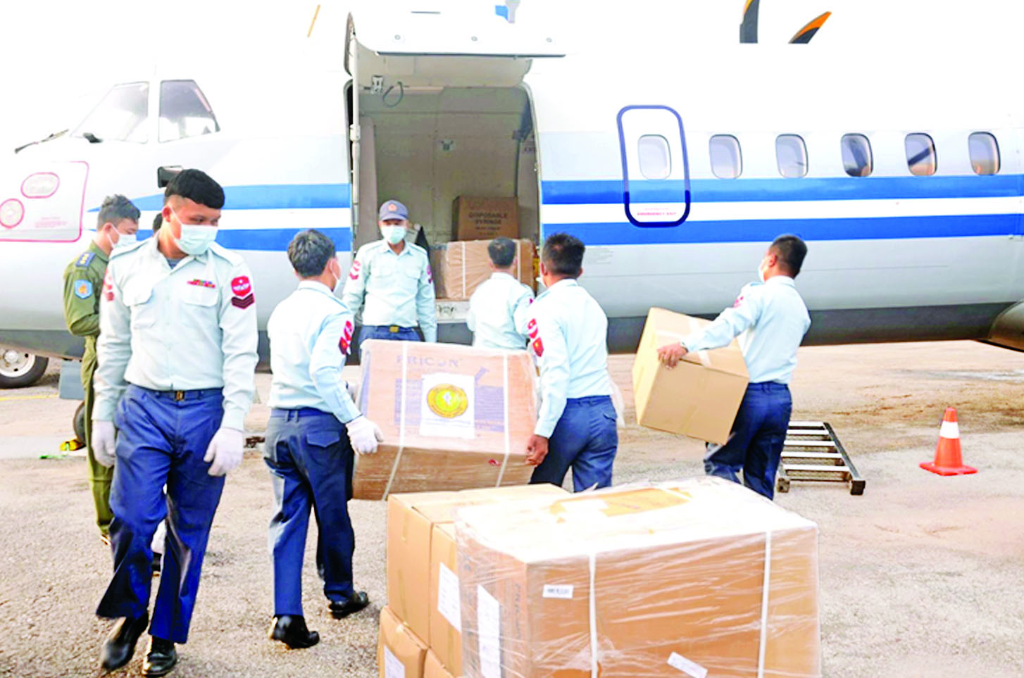 ကိုဗစ်-၁၉ ရောဂါကာကွယ်ဆေး Sinopharm များကို သတ်မှတ် အအေးလမ်းကြောင်း စံချိန်စံညွှန်းများအတိုင်း တပ်မတော်လေယာဉ်များ၊ မော်တော်ယာဉ်များဖြင့် ပို့ဆောင်ပေးလျက်ရှိသည်။