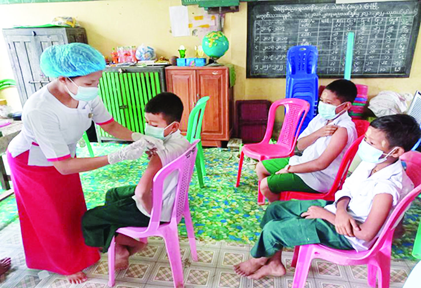 ထို့အတူ ကျောင်းသား ကျောင်းသူများကိုလည်း ကိုဗစ်-၁၉ ရောဂါ ကာကွယ်ဆေးများ ထိုးနှံပေးလျက်ရှိရာ ယနေ့တွင် ဧရာဝတီတိုင်းဒေသကြီးအတွင်းရှိ မြို့နယ် ၂၆ မြို့နယ်တို့၌ ကျောင်းသား ကျောင်းသူ ၁၆၈၂ ဦး၊ ရခိုင်ပြည်နယ်နှင့် ချင်း ပြည်နယ်အတွင်းရှိ မြို့နယ် ငါးမြို့နယ်တို့၌ ကျောင်းသား ကျောင်းသူ ၈၁၅ ဦးနှင့် မန္တလေး တိုင်းဒေသကြီးအတွင်းရှိ ခရိုင် ခုနစ်ခုတို့မှ ကျောင်းသား ကျောင်းသူ ၉၃၅၇ ဦးတို့ကို တပ်မတော်မှ ဆေးအဖွဲ့များက ပြည်သူ့ဆေးရုံများမှ ဆရာဝန်များ၊ သက်ဆိုင်ရာ ကျန်းမာရေးဝန်ထမ်း များ၊ စေတနာ့ဝန်ထမ်းများနှင့် ပူးပေါင်း၍ ကိုဗစ်-၁၉ ရောဂါ ကာကွယ်ဆေးထိုးနှံပေးသည်။