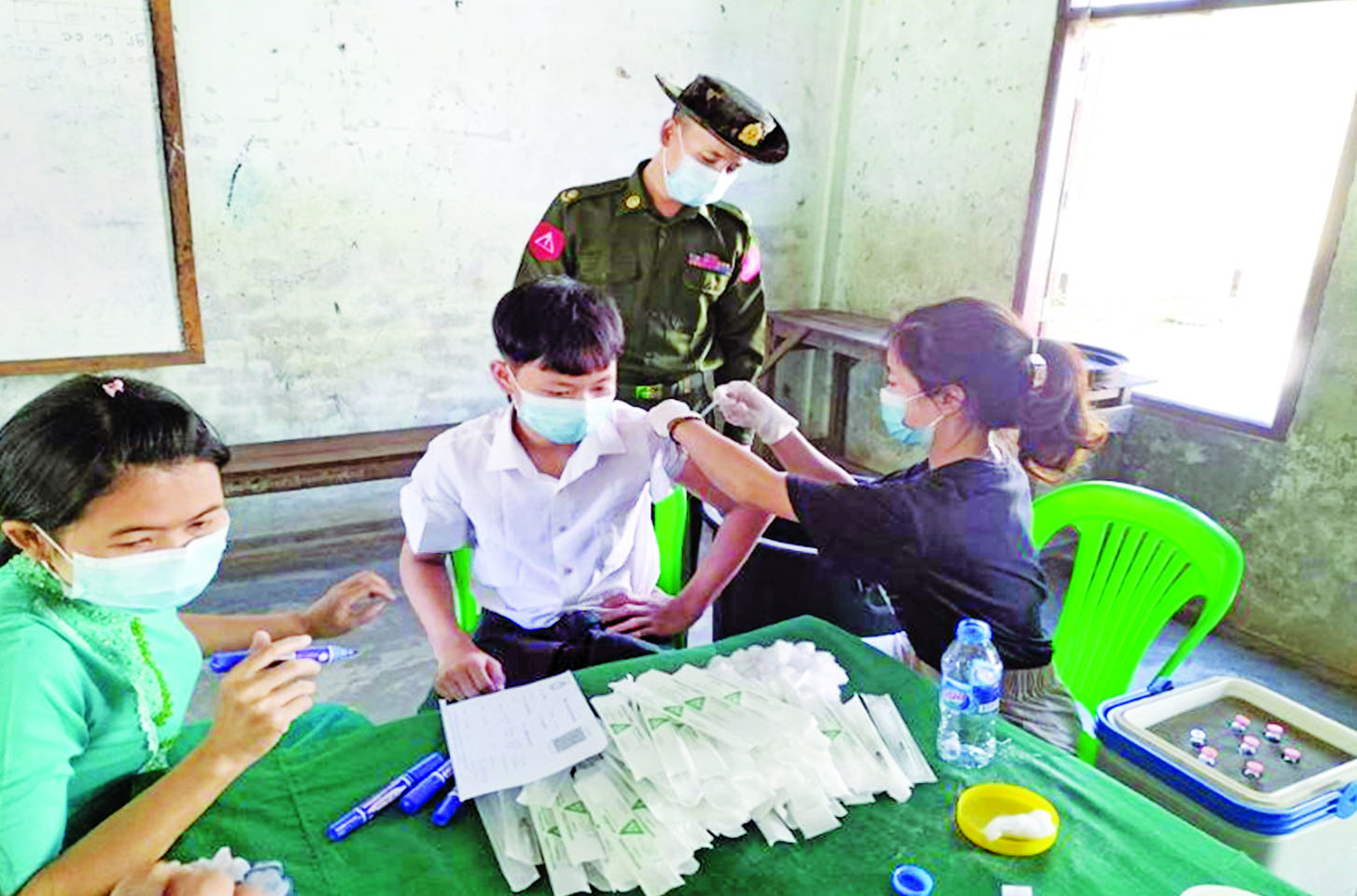 ထို့အတူ       ကျောင်းသား ကျောင်းသူများကိုလည်း ကိုဗစ်-၁၉ ရောဂါကာကွယ်ဆေးများ  ထိုးနှံပေးလျက်ရှိရာ  ယနေ့တွင် ရှမ်းပြည်နယ်   (အရှေ့ပိုင်း) မိုင်းဆတ် မြို့နယ်၌ ကျောင်းသား ကျောင်းသူ ၁၄၀၊  ဧရာဝတီတိုင်း ဒေသကြီးအတွင်းရှိ   မြို့နယ်  ၂၆ မြို့နယ်၌ ကျောင်းသားကျောင်းသူ ၂၉၃၂၄ ဦး (ဝဲအောက်ပုံ)၊ ရခိုင် ပြည်နယ်     ရသေ့တောင်မြို့နှင့်           ချင်းပြည်နယ်    ပလက်ဝမြို့တို့၌  ကျောင်းသား  ကျောင်းသူ   ၁၀၅   ဦးတို့ကို တပ်မတော်မှ ဆေးအဖွဲ့ များက    ပြည်သူ့ဆေးရုံများမှ ဆရာဝန်များ၊      သက်ဆိုင်ရာ  ကျန်းမာရေး      ဝန်ထမ်းများ၊   စေတနာ့          ဝန်ထမ်းများနှင့် ပူးပေါင်း၍  ကိုဗစ်- ၁၉  ရောဂါ ကာကွယ်ဆေးထိုးနှံပေးခြင်းများ   ဆောင်ရွက်ပေးသည်။