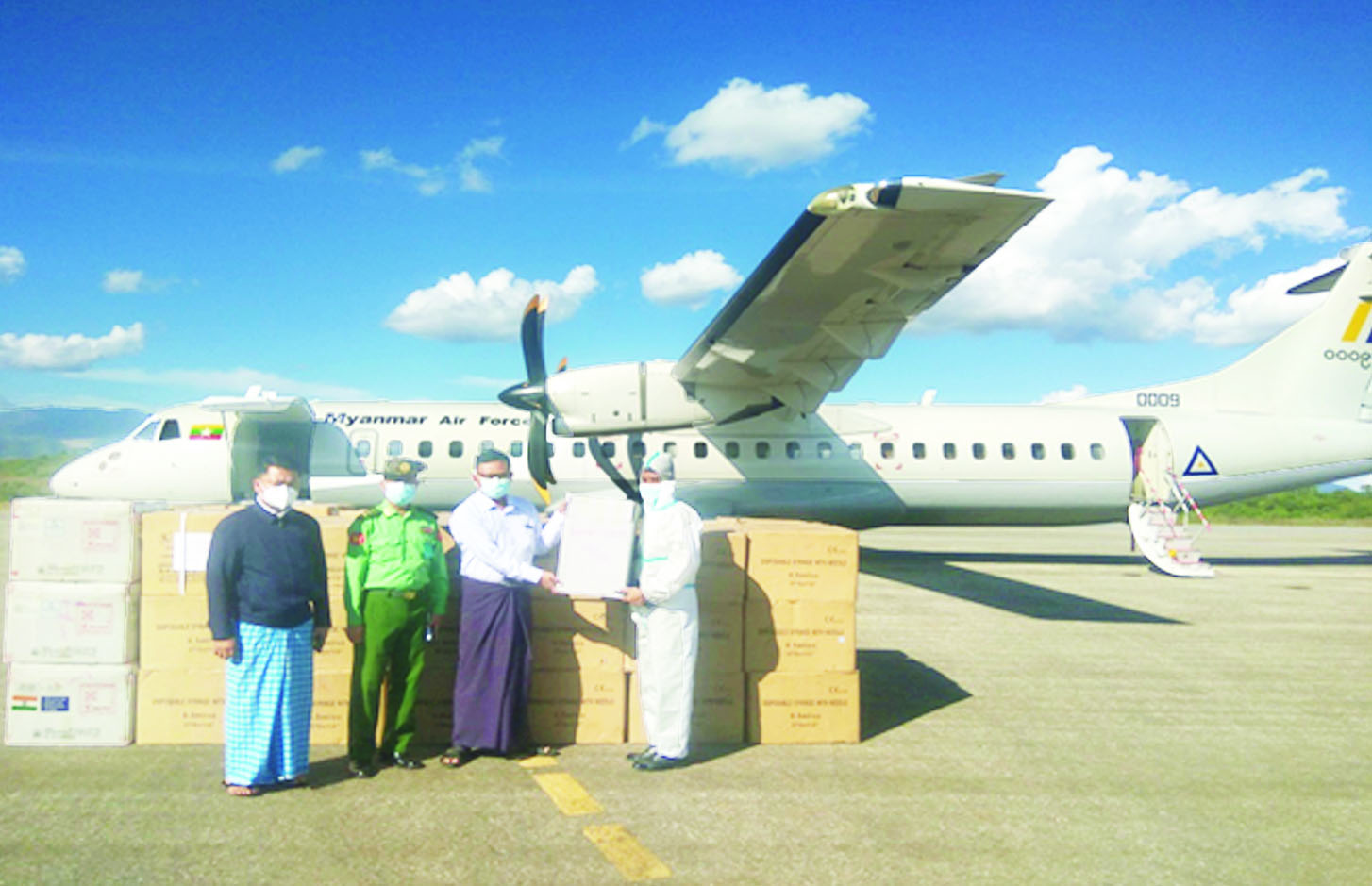 ကိုဗစ်-၁၉ ရောဂါ ကာကွယ်ဆေး များကို      တိုင်းဒေသကြီးနှင့် ပြည်နယ်အသီးသီးသို့ သတ်မှတ် အအေးလမ်းကြောင်း      စံချိန် စံညွှန်းများအတိုင်း တပ်မတော် (လေ)မှ  လေယာဉ်များ၊  Cold  Chain   Delivery   Logistics မော်တော်ယာဉ်ကြီးများဖြင့်   ပို့ဆောင်ဖြန့်ဖြူးပေးလျက်ရှိသည်။