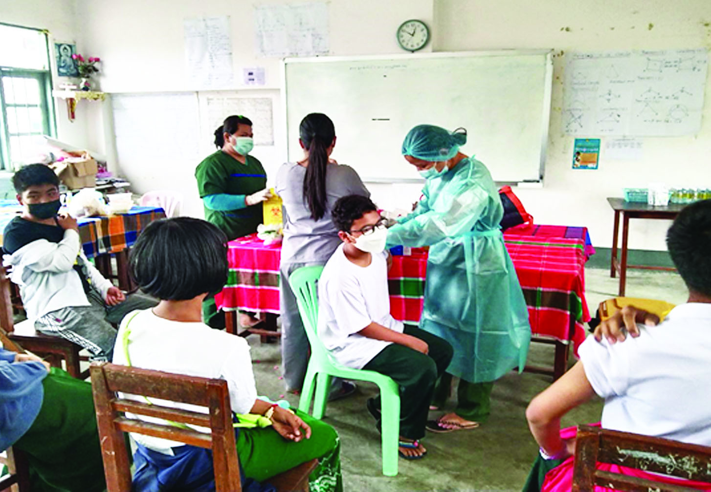 ထို့အတူ    ကျောင်းသား၊ ကျောင်းသူများကိုလည်း  ကိုဗစ်-၁၉ ရောဂါ   ကာကွယ်ဆေးများ ထိုးနှံပေးလျက်ရှိရာ   ယနေ့တွင် ရှမ်းပြည်နယ်အရှေ့ပိုင်း    တာချီ လိတ်မြို့နယ်၌     ကျောင်းသား၊ ကျောင်းသူ   ၄၉၉ ဦး     နှင့် ဧရာဝတီတိုင်းဒေသကြီးအတွင်းရှိ   မြို့နယ်        ၂၆     မြို့နယ်တို့၌ ကျောင်းသား၊ ကျောင်းသူ ၁၉၆   ဦး တို့ကို တပ်မတော်မှဆေးအဖွဲ့များ က ပြည်သူ့ဆေးရုံများမှ ဆရာဝန် များ၊  သက်ဆိုင်ရာ     ကျန်းမာရေး ဝန်ထမ်းများ၊  စေတနာ့ဝန်ထမ်း များနှင့်   ပူးပေါင်း၍ ကိုဗစ်- ၁၉ ရောဂါ      ကာကွယ်ဆေးထိုးနှံ ပေးခြင်းများ   ဆောင်ရွက်ပေး သည်။