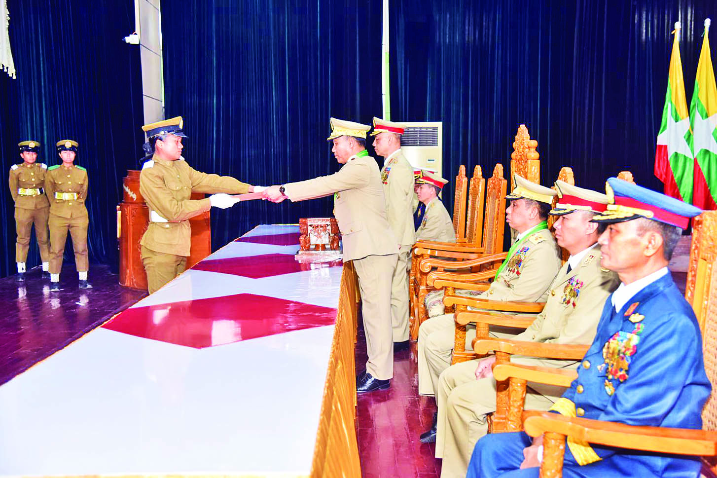တပ်မတော် (ကြည်း) ဗိုလ်သင်တန်းကျောင်း (မှော်ဘီ) ဘွဲ့ရအမျိုးသမီးဗိုလ်လောင်း သင်တန်း အမှတ်စဉ် (၉) ပြန်တမ်းဝင်အရာရှိ ခန့်အပ်ခြင်း အခမ်းအနားကို ယနေ့နံနက်ပိုင်းတွင် တပ်မတော် (ကြည်း) ဗိုလ်သင်တန်းကျောင်း (မှော်ဘီ) မြဝတီ ခန်းမ၌ကျင်းပရာ ကာကွယ်ရေးဦးစီးချုပ်ရုံး(ကြည်း) မှ စစ်ရာထူးခန့်ချုပ် ဒုတိယဗိုလ်ချုပ်ကြီး လင်းအောင်၊ ကာကွယ်ရေးဦးစီးချုပ်ရုံးမှ တပ်မတော်အရာရှိကြီး များ တပ်မတော် (ကြည်း) ဗိုလ်သင်တန်းကျောင်း (မှော်ဘီ) ကျောင်းအုပ်ကြီး ဗိုလ်မှူးချုပ် မင်းမင်းစိုး နှင့် ကျောင်းဆင်းဗိုလ်လောင်းများ တက်ရောက် ကြသည်။