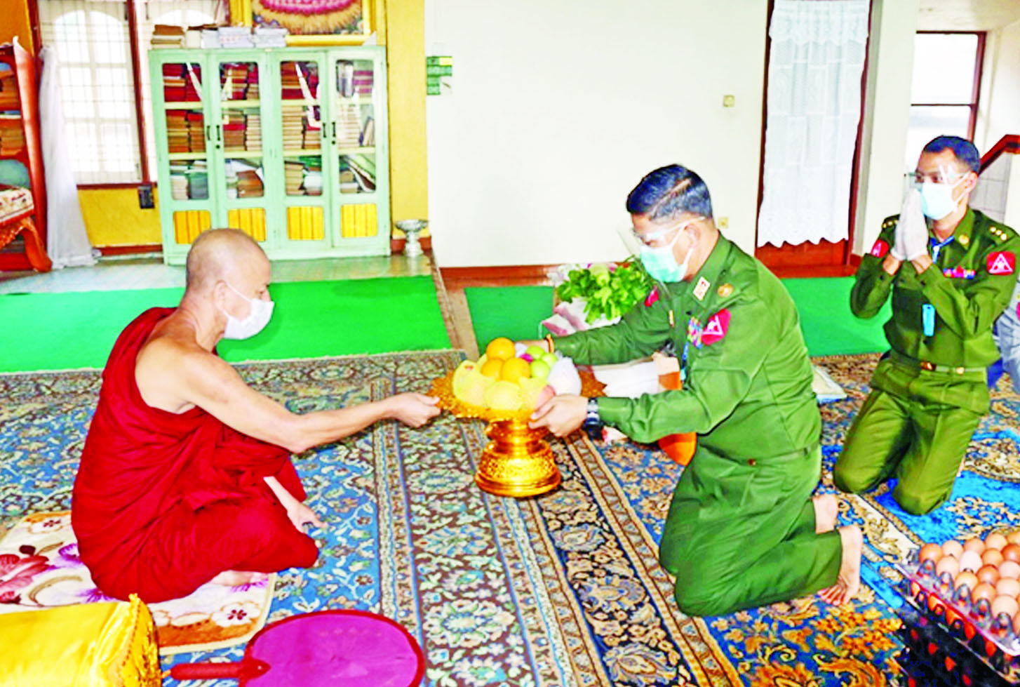 ထိုသို့ဆောင်ရွက်လျက်ရှိရာ နိုဝင်ဘာ ၅ ရက်နှင့် ယနေ့ တွင် ရှမ်းပြည်နယ်(အရှေ့ပိုင်း) ကျိုင်းတုံမြို့ ဓမ္မသုခတောရ ကျောင်းတိုက်၊ ထေရဝါဒဗုဒ္ဓ သာသနာပြုကျောင်းနှင့် သာသနာ့ ဝေပုလ္လပရိယတ္တိစာသင်တိုက်၊ မွန်ပြည်နယ် သထုံမြို့နယ် ပုဗ္ဗါရုံ ပရိယတ္တိစာသင်တိုက်၊ ရန်ကုန် တိုင်းဒေသကြီး မှော်ဘီမြို့နယ် သံတံတားကျေးရွာရှိ သိင်္ဂီဦး ပရိယတ္တိစာသင်တိုက်၊ ဒလ မြို့နယ် ပျော်ဘွယ်လေးကျေးရွာ ရှိ သာဓုကန်ကျောင်းတိုက်၊ ရွှေလှေချောင်းကျေးရွာရှိ အောင် ဇမ္ဘူမင်္ဂလာရွှေ ကျောင်းတိုက်၊ ခနောင်ကျေးရွာရှိ တောတဲကန် ကျောင်းတိုက်၊ တုံးတင်ဂံကျေးရွာ ရှိ ရေတံခါးကျောင်းတိုက်၊ ရခိုင် ပြည်နယ် အမ်းမြို့ ဒိုင်ကြီးဘုန်းတော်ကြီးကျောင်းနှင့် မန္တလေး တိုင်းဒေသကြီး ချမ်းမြသာစည် မြို့နယ် ဦးပွားကျောင်းတိုက်တို့ရှိ ဆရာတော်၊ သံဃာတော်များနှင့် သာသနာ့နွယ်ဝင် သီလရှင်များ အတွက် ဆွမ်းဆန်တော်၊ ဆီ၊ ဆား၊ ပဲ အမယ်လေးမျိုး၊ ကိုဗစ်-၁၉ ရောဂါ ကာကွယ်ရေးအထောက်အကူပြုပစ္စည်းများ၊ နေ့ဆွမ်း များနှင့် လှူဖွယ်ပစ္စည်းများကို သက်ဆိုင်ရာ တိုင်းဒေသကြီး ဝန်ကြီးချုပ်များ၊ တိုင်းစစ်ဌာနချုပ် အသီးသီးမှ တိုင်းမှူးများနှင့် တာဝန်ရှိသူများက သွားရောက်ဆက်ကပ်လှူဒါန်းခဲ့ကြကြောင်း သတင်းရရှိသည်။
