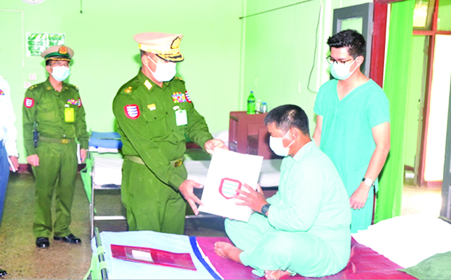 ရှမ်းပြည်နယ် (တောင်ပိုင်း) တောင်ကြီးမြို့ရှိ တပ်မတော် ဆေးရုံ၊ အောင်ပန်းမြို့ရှိ တပ်မတော် ဆေးရုံ၊ ဧရာဝတီတိုင်းဒေသကြီး ပုသိမ်မြို့ရှိ နယ်မြေခံဆေးတပ် ရင်း၊ တနင်္သာရီတိုင်းဒေသကြီး ကော့သောင်းမြို့ရှိ တပ်မတော် ဆေးရုံနှင့် စစ်ကိုင်းတိုင်းဒေသ ကြီး မုံရွာမြို့ရှိ တပ်မတော်ဆေးရုံ တို့၌ တက်ရောက်ကုသမှုခံယူ လျက်ရှိသော အရာရှိ၊ စစ်သည်၊ မိသားစုများနှင့် ဒေသခံပြည်သူ များအား ယနေ့တွင် တိုင်းဒေသ ကြီးနှင့် ပြည်နယ်များမှ ဝန်ကြီး ချုပ်များ၊ သက်ဆိုင်ရာ တိုင်းစစ် ဌာနချုပ်များမှ တိုင်းမှူးများနှင့် တာဝန်ရှိသူများက သွားရောက် ကြည့်ရှု၍ တစ်ဦးချင်း၏ ရောဂါ ဖြစ်ပွားမှုများ၊ ဆေးကုသပေးထား မှုနှင့် ကျန်းမာရေးတိုးတက်မှု အခြေအနေများကို ရင်းရင်းနှီးနှီး မေးမြန်း အားပေးစကားပြော ကြားကာ စားသောက်ဖွယ်ရာများ ပေးအပ်သည်။