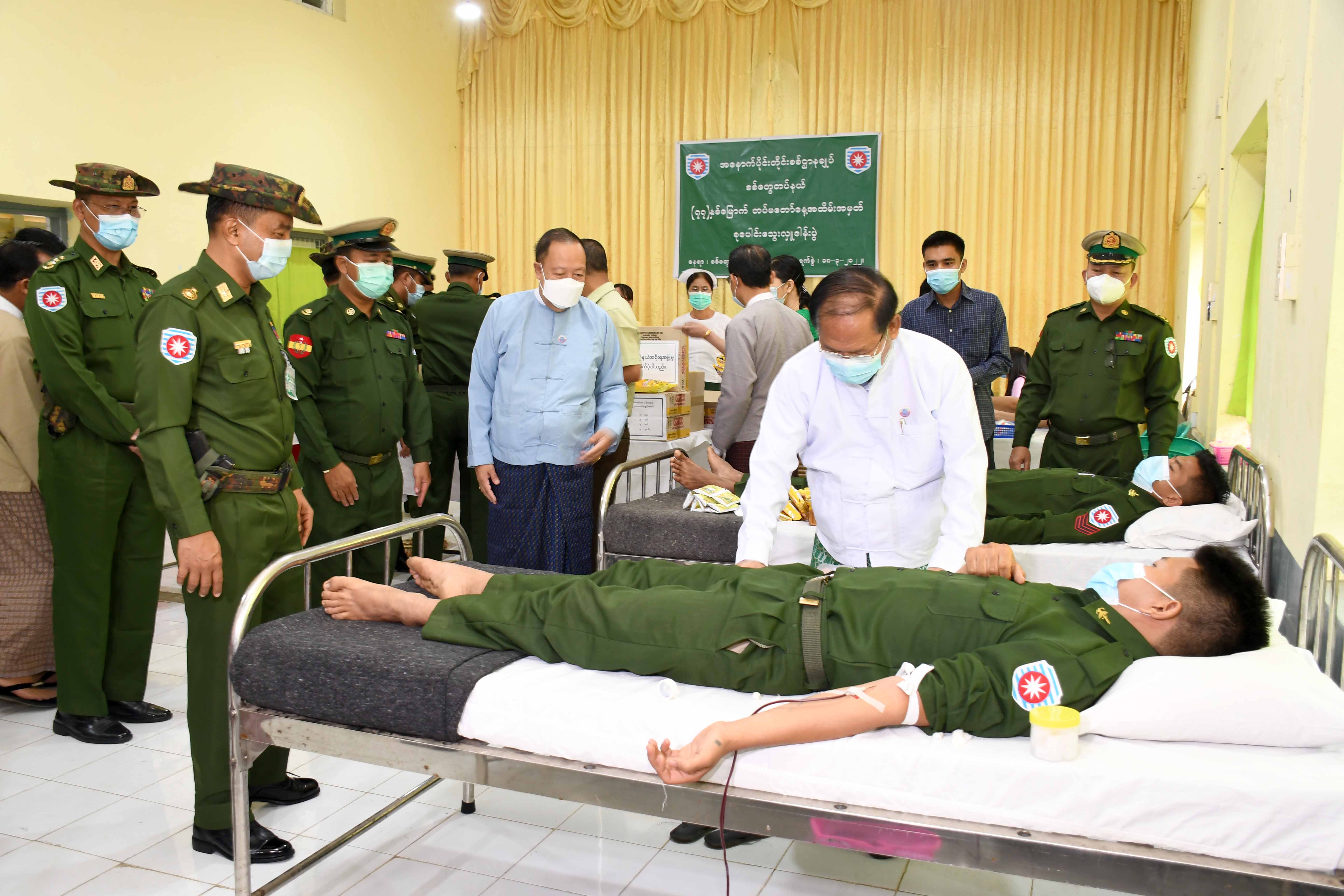 ပြည်နယ်ဝန်ကြီးချုပ်က သွေးလှူဒါန်း ကြမည့် တပ်မတော်သားများအား လိုက်လံ နှုတ်ဆက်အားပေးစကား ပြောကြားပြီးနောက် သွေးလှူဒါန်းကြသည့် တပ်မတော်သားများ အား ပြည်နယ်အစိုးရအဖွဲ့မှ လှူဒါန်းသော ကွေကာအုပ်၊ ဓာတ်ဆား၊ ခေါက်ဆွဲခြောက်နှင့် အားဖြည့်အချိုရည်များ၊ အလှူရှင်များက လှူဒါန်းသော ကြက်ဥနှင့် ဆန်ပြုတ်ထုပ် များကို ထောက်ပံ့ပေးအပ်ကြသည်။