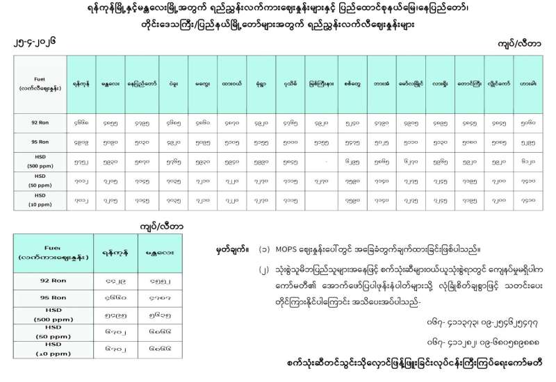 ရန်ကုန်မြို့နှင့် မန္တလေးမြို့အတွက် ရည်ညွှန်းလက်ကားဈေးနှုန်းများနှင့် ပြည်ထောင်စုနယ်မြေ နေပြည်တော်၊ တိုင်းဒေသကြီး/ပြည်နယ် မြို့တော်များအတွက် ရည်ညွှန်းလက်လီဈေးနှုန်းများ