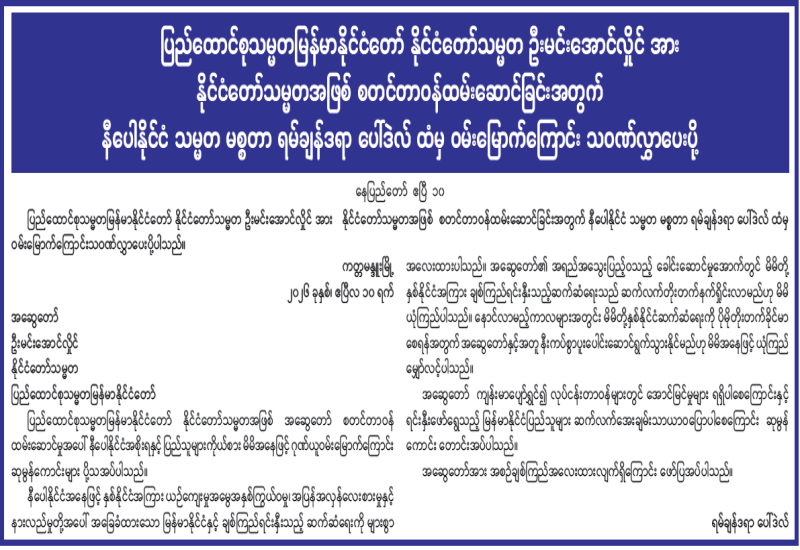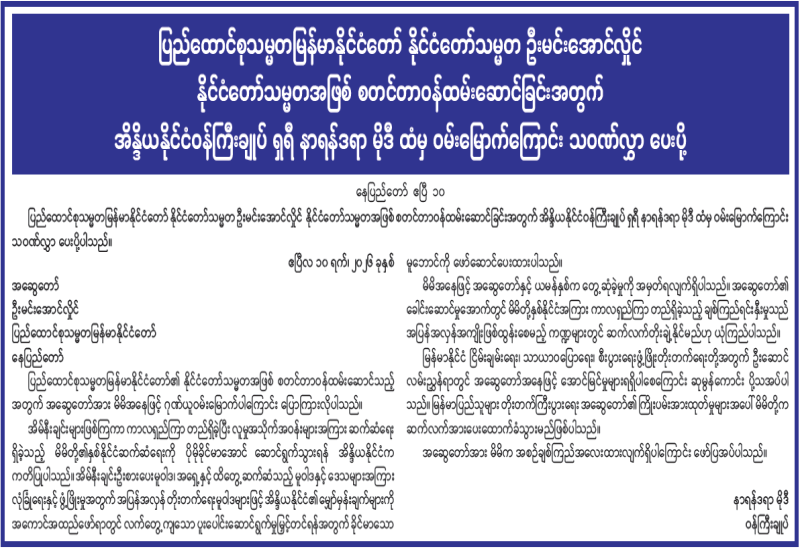 ပြည်ထောင်စုသမ္မတမြန်မာနိုင်ငံတော် နိုင်ငံတော်သမ္မတ ဦးမင်းအောင်လှိုင်အား နိုင်ငံတော်သမ္မတအဖြစ် ရွေးကောက်တင်မြှောက်ခြင်းခံရသည့်အတွက် ဘင်းမ်စတက် အတွင်းရေးမှူးချုပ် မစ္စတာ အင်ဒရာ မာနီ ပန်ဒေး ထံမှ ဝမ်းမြောက်ကြောင်း သဝဏ်လွှာပေးပို့