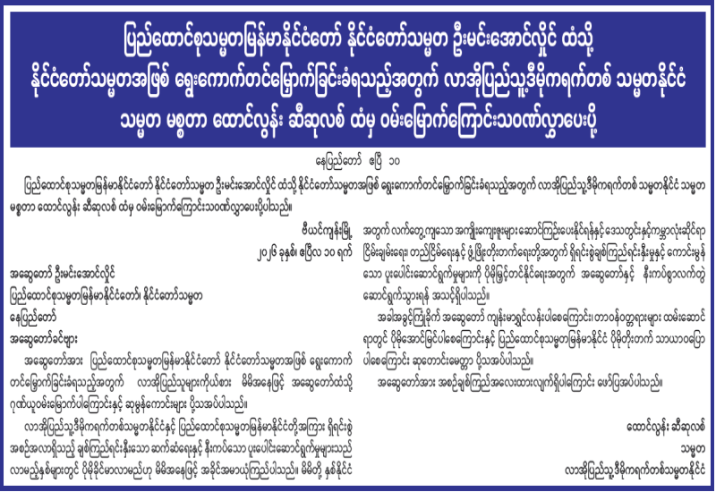 ပြည်ထောင်စုသမ္မတမြန်မာနိုင်ငံတော် နိုင်ငံတော်သမ္မတ ဦးမင်းအောင်လှိုင် ထံသို့ ဂျပန်နိုင်ငံ နာဂိုယာမြို့ရှိ မြန်မာဂုဏ်ထူးဆောင်ကောင်စစ်ဝန် မစ္စတာ တိုရှိအို နီရှိမူရ (Mr. Toshio Nishimura) ထံမှ ဝမ်းမြောက်ကြောင်း သဝဏ်လွှာပေးပို့