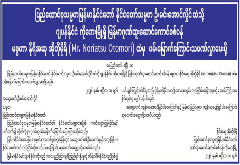 ပြည်ထောင်စုသမ္မတမြန်မာနိုင်ငံတော် နိုင်ငံတော်သမ္မတ ဦးမင်းအောင်လှိုင် ထံသို့ ဂျပန်နိုင်ငံ ကိုဘေးမြို့ရှိ မြန်မာဂုဏ်ထူးဆောင်ကောင်စစ်ဝန် မစ္စတာ နိုရိအဆု အိုတိုမိုရိ (Mr. Noriatsu Otomori) ထံမှ ဝမ်းမြောက်ကြောင်းသဝဏ်လွှာပေးပို့