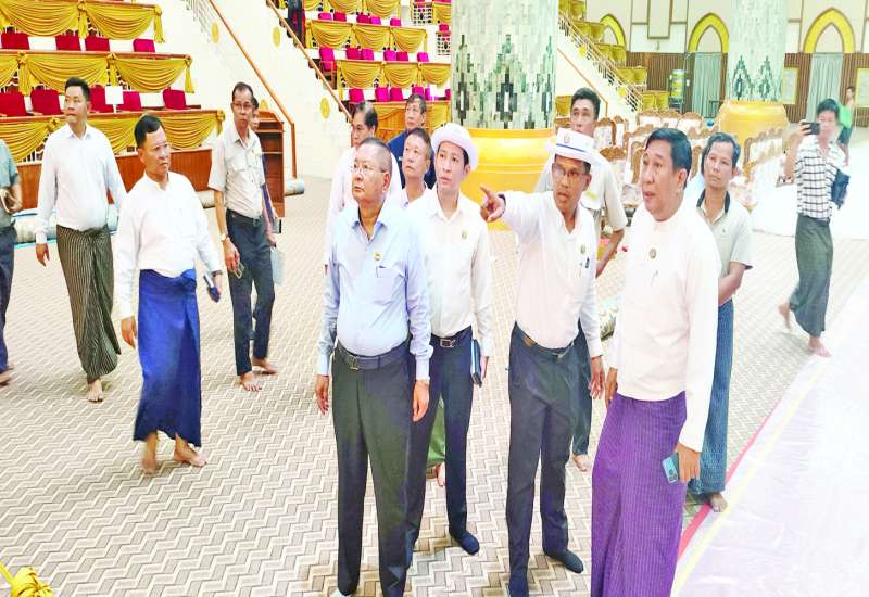 ဆဋ္ဌသင်္ဂါယနာတင်အောင်ပွဲ နှစ်(၇၀)ပြည့် အထိမ်းအမှတ် မဟာမင်္ဂလာအခမ်းအနား ကျင်းပမည့် သမိုင်းဝင်အဆောက်အအုံများနှင့်လမ်းများ ပြုပြင်မွမ်းမံထိန်းသိမ်းရေးလုပ်ငန်း ဆပ်ကော်မတီဥက္ကဋ္ဌ ဆောက်လုပ်ရေးဝန်ကြီးဌာန ဒုတိယဝန်ကြီး ဦးမျိုးမြင့်သည် ရန်ကုန်မြို့တော်ဝန်၊ လျှပ်စစ်၊ စွမ်းအင်၊ စက်မှုနှင့် လမ်းပန်းဆက်သွယ်ရေးဝန်ကြီးနှင့်အတူ လုပ်ငန်းဆောင်ရွက်နေမှုအခြေအနေကို ကြည့်ရှုစစ်ဆေးသည်။