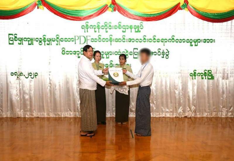 နိုင်ငံတော်စီမံအုပ်ချုပ်ရေးကောင်စီသည် PDF အပါအဝင် အဖွဲ့အစည်းအမျိုးမျိုးအမည်ခံ၍ လက်နက်ကိုင် ဆန့်ကျင်လျက်ရှိသည့် အဖွဲ့အစည်းများအတွင်းရောက်ရှိ နေသူများအား ဥပဒေဘောင်အတွင်းသို့ ပြန်လည်ဝင်ရောက်ရန်ဖိတ်ခေါ်၍ ဥပဒေဘောင်အတွင်းသို့ ဝင်ရောက်လာသူများကို လိုအပ်သည့် ကူညီပံ့ပိုးမှုများ ဆောင်ရွက်ပေးသွားမည်ဖြစ်ကြောင်းနှင့် လက်နက်/ခဲယမ်းများဖြင့် ဝင်ရောက်လာသူများကို ဆုကြေးငွေများ ထောက်ပံ့ပေးသွားမည်ဖြစ်ကြောင်း ထုတ်ပြန်ထားရှိပြီးဖြစ်ရာ ယနေ့နံနက်ပိုင်းတွင်လည်း ပြစ်မှုကျူးလွန်ခြင်းမရှိသော PDF အဖွဲ့မှ အလင်းဝင်ရောက်လာသူများအား မိဘအုပ်ထိန်းသူများထံ ပြန်လည်လွှဲပြောင်းပေးအပ်ခြင်းကို ရန်ကုန်တိုင်းဒေသကြီး အစိုးရအဖွဲ့ရုံး မင်္ဂလာခန်းမ၌ပြုလုပ်ရာ တိုင်းဒေသကြီးဝန်ကြီးချုပ် ဦးစိုးသိန်း၊ ရန်ကုန်တိုင်းစစ်ဌာနချုပ်တိုင်းမှူး ဗိုလ်ချုပ်ဇော်ဟိန်း၊ ဌာနဆိုင်ရာတာဝန်ရှိသူများ၊ ဥပဒေဘောင်အတွင်း ဝင်ရောက်လာသူများနှင့် ၎င်းတို့၏ မိဘအုပ်ထိန်းသူများ တက်ရောက်ကြသည်။