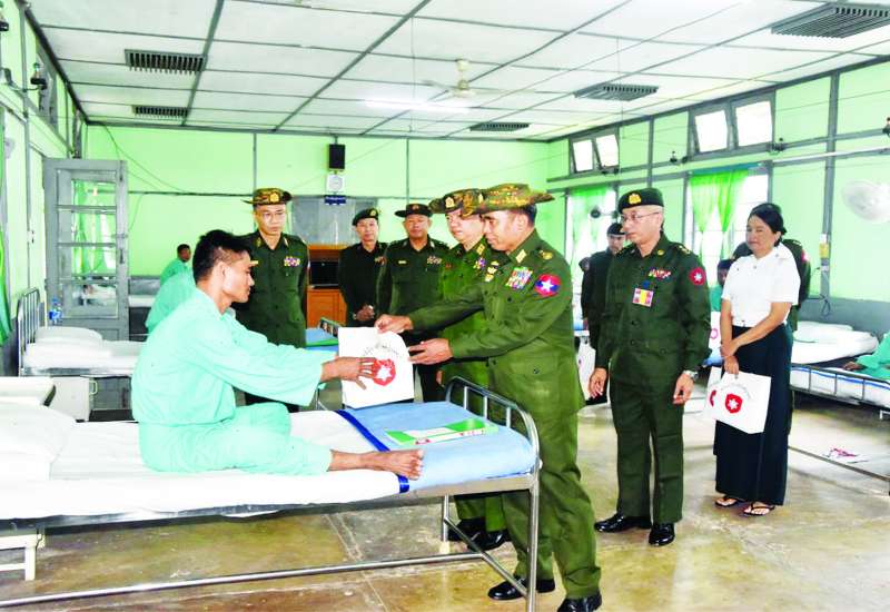 ပဲခူးတိုင်းဒေသကြီး တောင်ငူမြို့ရှိ နယ်မြေခံတပ်မတော်ဆေးရုံ၌ တက်ရောက်ဆေးကုသမှုခံယူလျက်ရှိသော အရာရှိ၊ စစ်သည်၊ မိသားစုများနှင့် ဒေသခံပြည်သူ များအား ယနေ့နံနက်ပိုင်းတွင် ကာကွယ်ရေးဦးစီးချုပ်ရုံး(ကြည်း)မှ ဒုတိယဗိုလ်ချုပ်ကြီး ဖုန်းမြတ်၊ တောင်ပိုင်းတိုင်းစစ်ဌာနချုပ်တိုင်းမှူး ဗိုလ်မှူးချုပ် ကြည်သိုက်နှင့် တာဝန်ရှိသူများက သွားရောက် ကြည့်ရှု၍ တစ်ဦးချင်း၏ ရောဂါဖြစ်ပွားမှု၊ ဆေးဝါးကုသပေးထားမှုနှင့် ကျန်းမာရေးတိုးတက်ကောင်းမွန်မှုအခြေအနေများကို ရင်းရင်းနှီးနှီးမေးမြန်းအားပေး စကားပြောကြားကာ စားသောက်ဖွယ်ရာများ ထောက်ပံ့ပေးအပ်သည်။