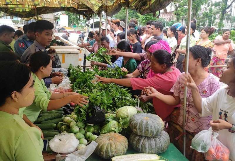 ဆိုင်ကလုန်းမုန်တိုင်း(မိုခါ) တိုက်ခတ်မှုကြောင့် မုန်တိုင်းဒဏ်သင့် ဒေသခံပြည်သူများနှင့် ဌာနဆိုင်ရာဝန်ထမ်းများ၏ စားသောက်ရေး အဆင်ပြေစေရန်နှင့် မိမိတို့အလိုရှိရာ စားသောက်ကုန်ပစ္စည်းများကို ဈေးနှုန်းသက်သာစွာဖြင့် ဝယ်ယူစားသောက်နိုင်ရေးအတွက် အနောက်ပိုင်းတိုင်းစစ်ဌာနချုပ်၊ နယ်မြေခံတပ်မတော်သားများနှင့် တာဝန်ရှိသူများက နေ့စဉ်ရောင်းချပေးလျက်ရှိသည်။