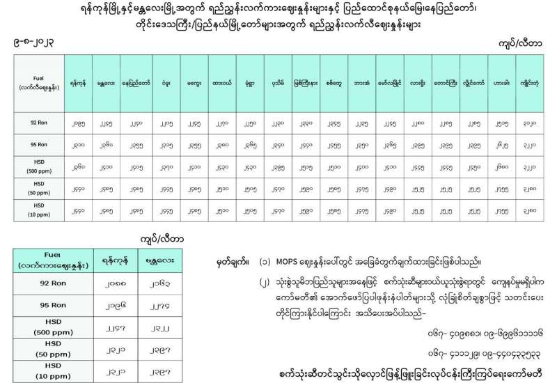 ရန်ကုန်မြို့နှင့် မန္တလေးမြို့အတွက် ရည်ညွှန်းလက်ကားဈေးနှုန်းများနှင့် ပြည်ထောင်စုနယ်မြေ နေပြည်တော်၊ တိုင်းဒေသကြီး/ပြည်နယ် မြို့တော်များအတွက် ရည်ညွှန်းလက်လီဈေးနှုန်းများ