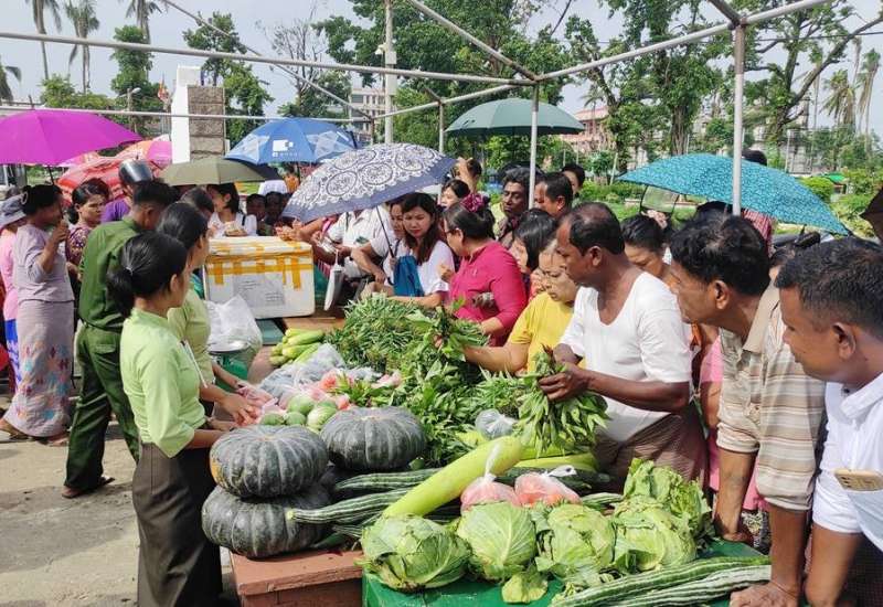ဆိုင်ကလုန်းမုန်တိုင်း (မိုခါ) တိုက်ခတ်မှုကြောင့် မုန်တိုင်းဒဏ်သင့် ဒေသခံပြည်သူများနှင့် ဌာနဆိုင်ရာဝန်ထမ်းများ၏ စားသောက်ရေး အဆင်ပြေစေရန်နှင့် မိမိတို့အလိုရှိရာ စားသောက်ကုန် ပစ္စည်းများကို ဈေးနှုန်းသက်သာစွာဖြင့် ဝယ်ယူ စားသောက်နိုင်ရေးအတွက် အနောက်ပိုင်း တိုင်းစစ်ဌာနချုပ်၊ နယ်မြေခံတပ်မတော်သားများနှင့် တာဝန်ရှိသူများက နေ့စဉ်ရောင်းချပေးလျက်ရှိသည်။