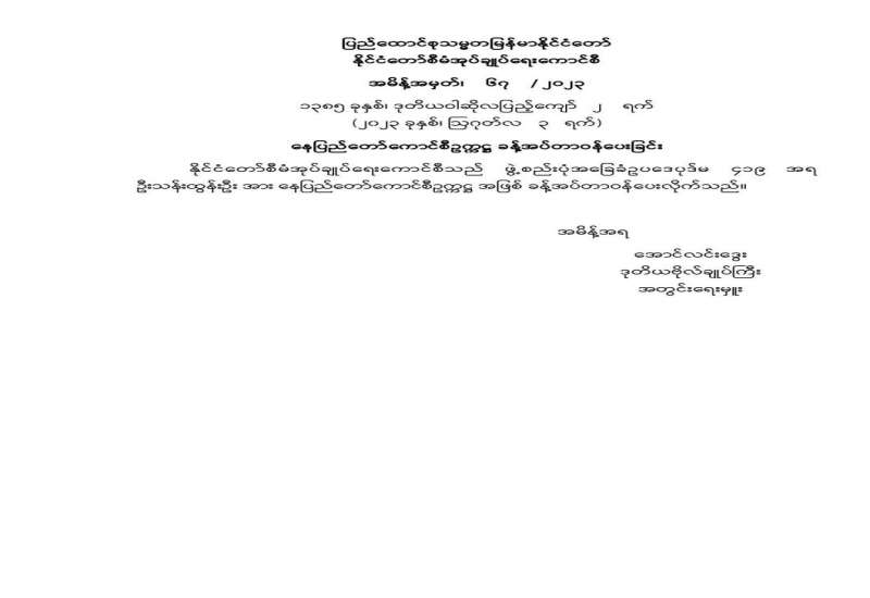 ပြည်ထောင်စုသမ္မတမြန်မာနိုင်ငံတော် နိုင်ငံတော်စီမံအုပ်ချုပ်ရေးကောင်စီ အမိန့်အမှတ်၊ ၆၈ / ၂၀၂၃ ၁၃၈၅ ခုနှစ်၊ ဒုတိယဝါဆိုလပြည့်ကျော် ၂ ရက် (၂၀၂၃ ခုနှစ်၊ ဩဂုတ်လ ၃ ရက်) မြန်မာနိုင်ငံအမျိုးသားလူ့အခွင့်အရေးကော်မရှင် ဥက္ကဋ္ဌ ခန့်အပ်တာဝန်ပေးခြင်း