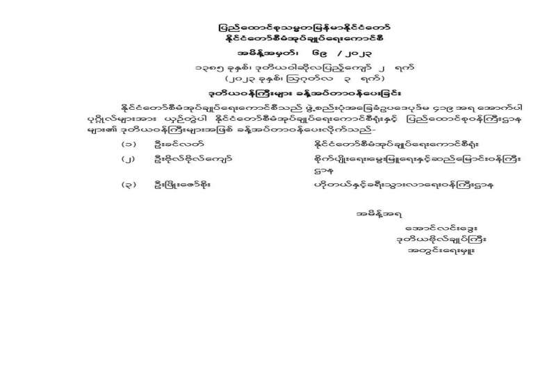 ပြည်ထောင်စုသမ္မတမြန်မာနိုင်ငံတော် နိုင်ငံတော်စီမံအုပ်ချုပ်ရေးကောင်စီ အမိန့်အမှတ်၊ ၆၉ / ၂၀၂၃ ၁၃၈၅ ခုနှစ်၊ ဒုတိယဝါဆိုလပြည့်ကျော် ၂ ရက် (၂၀၂၃ ခုနှစ်၊ ဩဂုတ်လ ၃ ရက်) ဒုတိယဝန်ကြီးများ ခန့်အပ်တာဝန်ပေးခြင်း