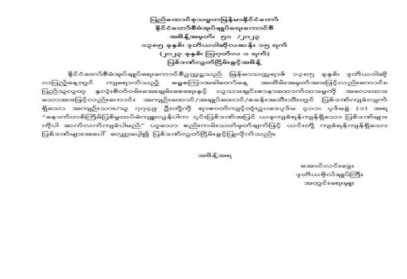 ၁။ မြန်မာနိုင်ငံတွင် ၁၄-၅-၂၀၂၃ ရက်နေ့တွင် ဖြစ်ပွားခဲ့သည့် အလွန့်အလွန်အားကောင်းသော ဆိုင်ကလုန်း မုန်တိုင်း မိုခါကြောင့် ဘေးသင့်ပြည်သူများအတွက် ပါဝင်လှူဒါန်းလိုသော စေတနာရှင်ပြည်သူများ အနေဖြင့် မြန်မာကျပ်ငွေစာရင်းအမှတ် OA -011834 နှင့် နိုင်ငံခြားငွေစာရင်းအမှတ် 1DA- 0300086 သို့ ထည့်ဝင်လှူဒါန်းနိုင်ကြောင်း ကြေညာခဲ့ပါသည်။