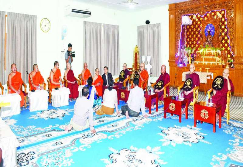 နိုင်ငံတော်သံဃမဟာနာယကအဖွဲ့ အကျိုးတော်ဆောင် အဂ္ဂမဟာပဏ္ဍိတ အဂ္ဂမဟာသဒ္ဓမ္မ ဇောတိကဓဇ သန်လျင်မင်းကျောင်းဆရာတော် ဒေါက်တာဘဒ္ဒန္တစန္ဒိမာဘိဝံသ အမှူးပြုသော နိုင်ငံတော်သံဃမဟာနာယက ဆရာတော်ကြီးလေးပါးနှင့် နေပြည်တော် ဒက္ခိဏသီရိမြို့နယ်၌ တည်ထားကိုးကွယ် လျက်ရှိသော မာရဝိဇယဗုဒ္ဓရုပ်ပွားတော်မြတ်ကြီး ဗုဒ္ဓါဘိသေက အနေကဇာတင်ပွဲသို့ ကြွရောက်တော်မူလာကြသည့် လာအိုနိုင်ငံသံဃရာဇာဆရာတော်ကြီး အဘိဓဇအဂ္ဂမဟာ သဒ္ဓမ္မဇောတိက Most Ven. Bounma Simmaphom နှင့်အဖွဲ့တို့ တွေ့ဆုံပွဲအခမ်း အနားကို ယနေ့မွန်းလွဲ ၂ နာရီက ရန်ကုန်တိုင်း ဒေသကြီး မရမ်းကုန်းမြို့နယ် ကမ္ဘာအေးကုန်းမြေ မဟာနာယကကျောင်းဆောင် ဘုရားခန်းမ၌ ကျင်းပသည်။