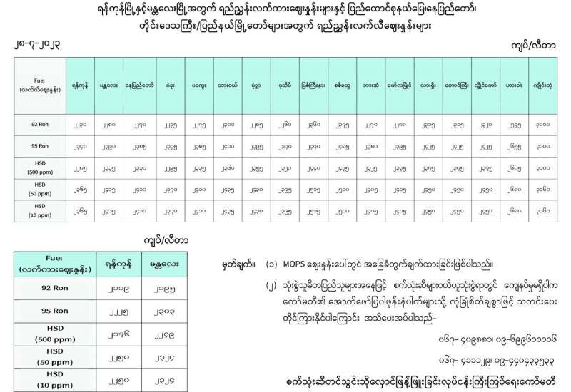 ရန်ကုန်မြို့နှင့် မန္တလေးမြို့အတွက် ရည်ညွှန်းလက်ကားဈေးနှုန်းများနှင့် ပြည်ထောင်စုနယ်မြေ နေပြည်တော်၊ တိုင်းဒေသကြီး/ ပြည်နယ် မြို့တော်များအတွက် ရည်ညွှန်းလက်လီဈေးနှုန်းများ