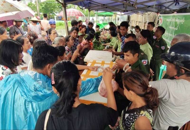 ဆိုင်ကလုန်းမုန်တိုင်း(မိုခါ)တိုက်ခတ်မှုကြောင့် မုန်တိုင်းဒဏ်သင့် ဒေသခံပြည်သူများနှင့် ဌာနဆိုင်ရာဝန်ထမ်းများ၏ စားသောက်ရေးအဆင်ပြေစေရန်နှင့် မိမိတို့အလိုရှိရာ စားသောက်ကုန်ပစ္စည်းများကို ဈေးနှုန်းသက်သာစွာဖြင့် ဝယ်ယူစားသောက်နိုင်ရေးအတွက် အနောက်ပိုင်းတိုင်းစစ်ဌာနချုပ်၊ နယ်မြေခံတပ်မတော်သားများနှင့် တာဝန်ရှိသူများက နေ့စဉ်ရောင်းချပေးလျက်ရှိသည်။