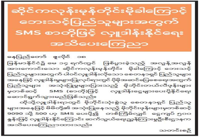 ဆိုင်ကလုန်းမုန်တိုင်းမိုခါကြောင့် ဘေးသင့်ပြည်သူများအတွက် SMS စာတိုဖြင့် လှူဒါန်းနိုင်ရေး အသိပေးကြေညာ