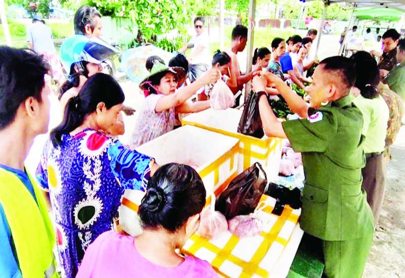 ဆိုင်ကလုန်းမုန်တိုင်း မိုခါတိုက်ခတ်မှုကြောင့် ပျက်စီးမှုများဖြစ်ပေါ်ခဲ့သည့် စစ်တွေမြို့ရှိ မုန်တိုင်းဒဏ်သင့်ဒေသခံပြည်သူများနှင့် ဌာနဆိုင်ရာဝန်ထမ်းများ၏ စားသောက်ရေးအဆင်ပြေစေရန်နှင့် မိမိတို့အလိုရှိရာ စားသောက်ကုန်ပစ္စည်းများကို ဈေးနှုန်းသက်သာစွာဖြင့် ဝယ်ယူစားသောက်နိုင်ရေးအတွက် အနောက်ပိုင်းတိုင်း စစ်ဌာနချုပ်၊ နယ်မြေခံတပ်မတော်သားများနှင့် တာဝန်ရှိသူများက နေ့စဉ်ရောင်းချပေးလျက်ရှိသည်။