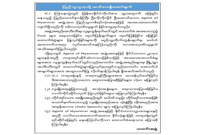 ICJ ကြားနာပွဲတွင် မြန်မာနိုင်ငံကိုယ်စား သွားရောက်ဖြေရှင်းနေသည့် ပြည်ထောင်စုဝန်ကြီး ဦးကိုကိုလှိုင် ဦးဆောင်သော Agent of Myanmar အဖွဲ့အား ပြည်သူတစ်ရပ်လုံးအနေဖြင့် အားပေးထောက်ခံလျက်ရှိသည်ကို ဝမ်းသာဂုဏ်ယူဖွယ် မြင်တွေ့ရပါသည်။