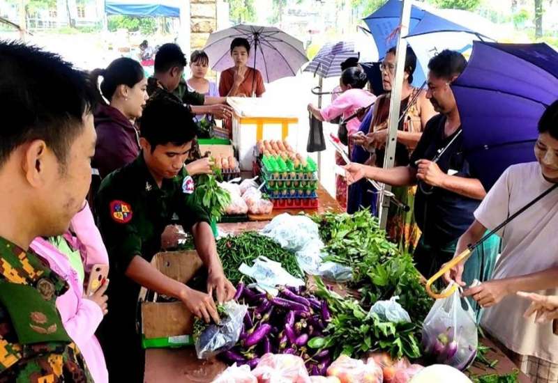 ဆိုင်ကလုန်းမုန်တိုင်း(မိုခါ)တိုက်ခတ်မှုကြောင့် ပျက်စီးမှုများဖြစ်ပေါ်ခဲ့သည့် စစ်တွေမြို့ရှိ မုန်တိုင်းဒဏ်သင့်ဒေသခံပြည်သူများနှင့် ဌာနဆိုင်ရာဝန်ထမ်းများ၏ စားသောက်ရေးအဆင်ပြေစေရန်နှင့် မိမိတို့အလိုရှိရာ စားသောက်ကုန်ပစ္စည်းများကို ဈေးနှုန်းသက်သာစွာဖြင့် ဝယ်ယူစားသောက်နိုင်ရေးအတွက် အနောက်ပိုင်းတိုင်း စစ်ဌာနချုပ်၊ နယ်မြေခံတပ်မတော်သားများနှင့် တာဝန်ရှိသူများက နေ့စဉ်ရောင်းချပေးလျက်ရှိသည်။