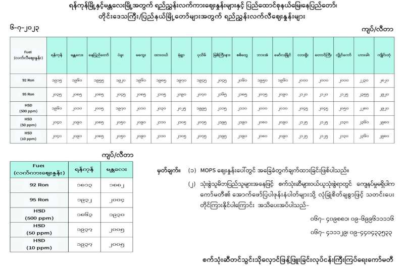 ရန်ကုန်မြို့နှင့် မန္တလေးမြို့အတွက် ရည်ညွှန်းလက်ကားဈေးနှုန်းများနှင့် ပြည်ထောင်စုနယ်မြေ နေပြည်တော်၊ တိုင်းဒေသကြီး/ပြည်နယ်မြို့တော်များအတွက် ရည်ညွှန်းလက်လီဈေးနှုန်းများ