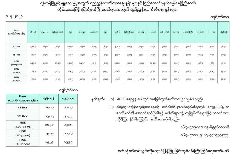 ရန်ကုန်မြို့နှင့် မန္တလေးမြို့အတွက် ရည်ညွှန်းလက်ကားဈေးနှုန်းများနှင့် ပြည်ထောင်စုနယ်မြေ နေပြည်တော်၊ တိုင်းဒေသကြီး/ပြည်နယ် မြို့တော်များအတွက် ရည်ညွှန်းလက်လီဈေးနှုန်းများ