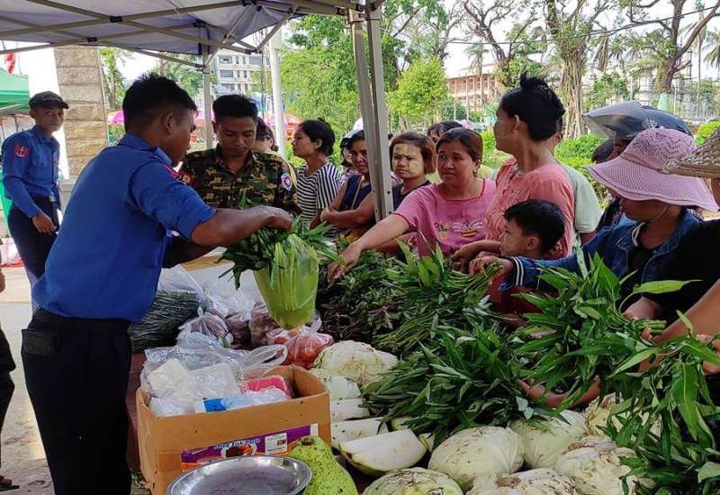 ဆိုင်ကလုန်းမုန်တိုင်း(မိုခါ)တိုက်ခတ်မှုကြောင့် ပျက်စီးမှုများဖြစ်ပေါ်ခဲ့သည့် စစ်တွေမြို့ရှိ မုန်တိုင်းဒဏ်သင့်ဒေသခံပြည်သူများနှင့် ဌာနဆိုင်ရာဝန်ထမ်းများ၏ စားသောက်ရေးအဆင်ပြေစေရန်နှင့် မိမိတို့အလိုရှိရာ စားသောက်ကုန်ပစ္စည်းများကို ဈေးနှုန်းသက်သာစွာဖြင့် ဝယ်ယူစားသောက်နိုင်ရေးအတွက် အနောက်ပိုင်းတိုင်းစစ်ဌာနချုပ်၊ နယ်မြေခံတပ်မတော်သားများနှင့် တာဝန်ရှိသူများက နေ့စဉ်ရောင်းချပေးလျက်ရှိသည်။