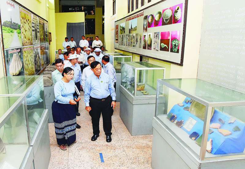 ရခိုင်ပြည်နယ်အတွင်း ပြန်လည်ထူထောင်ရေးလုပ်ငန်းများကို အနီးကပ်ကြီးကြပ်ကွပ်ကဲရန် စစ်တွေမြို့၌ရောက်ရှိနေသော သမဝါယမနှင့်ကျေးလက်ဖွံ့ဖြိုးရေးဝန်ကြီးဌာန ပြည်ထောင်စု ဝန်ကြီးဦးလှမိုးသည် ပြည်နယ်ဝန်ကြီးချုပ် ဦးထိန်လင်း၊ ဒုတိယဝန်ကြီးများ၊ တာဝန်ရှိသူများနှင့်အတူ ယနေ့နံနက်ပိုင်းတွင် ယဉ်ကျေးမှုပြတိုက်နှင့် စာကြည့်တိုက်သို့ရောက်ရှိပြီး ပြတိုက်အတွင်းခင်းကျင်းပြသထားသည့် ရှေးဟောင်းအမွေအနှစ်များနှင့် ပြကွင်းပြကွက်များကို လှည့်လည် ကြည့်ရှုလေ့လာသည်။