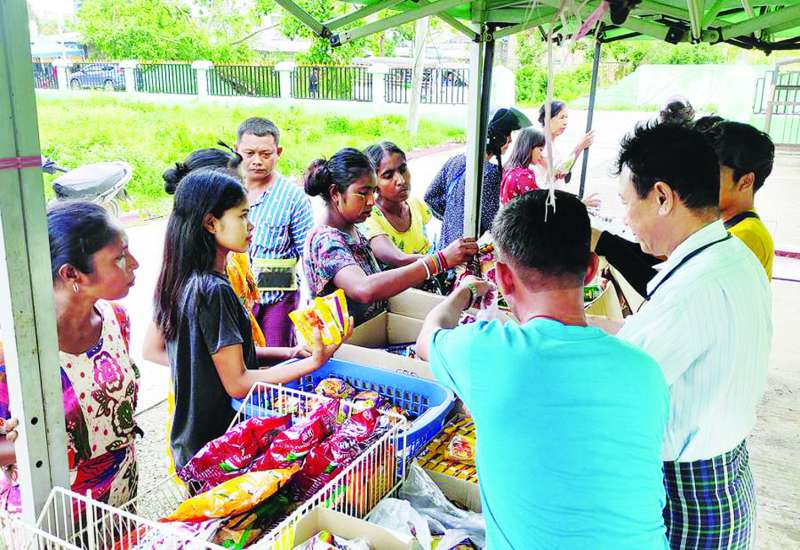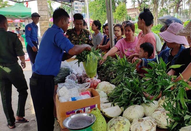 ဆိုင်ကလုန်းမုန်တိုင်း(မိုခါ)တိုက်ခတ်မှုကြောင့် ပျက်စီးမှုများ ဖြစ်ပေါ်ခဲ့သည့် စစ်တွေမြို့ရှိ မုန်တိုင်းဒဏ်သင့် ဒေသခံပြည်သူများနှင့် ဌာနဆိုင်ရာဝန်ထမ်းများ၏ စားသောက်ရေး အဆင်ပြေစေရန်နှင့် မိမိတို့အလိုရှိရာ စားသောက်ကုန်ပစ္စည်းများကို ဈေးနှုန်းသက်သာစွာဖြင့် ဝယ်ယူစားသောက်နိုင်ရေးအတွက် အနောက်ပိုင်းတိုင်း စစ်ဌာနချုပ်၊ နယ်မြေခံတပ်မတော်သားများနှင့် တာဝန်ရှိသူများက နေ့စဉ်ရောင်းချပေးလျက်ရှိသည်။