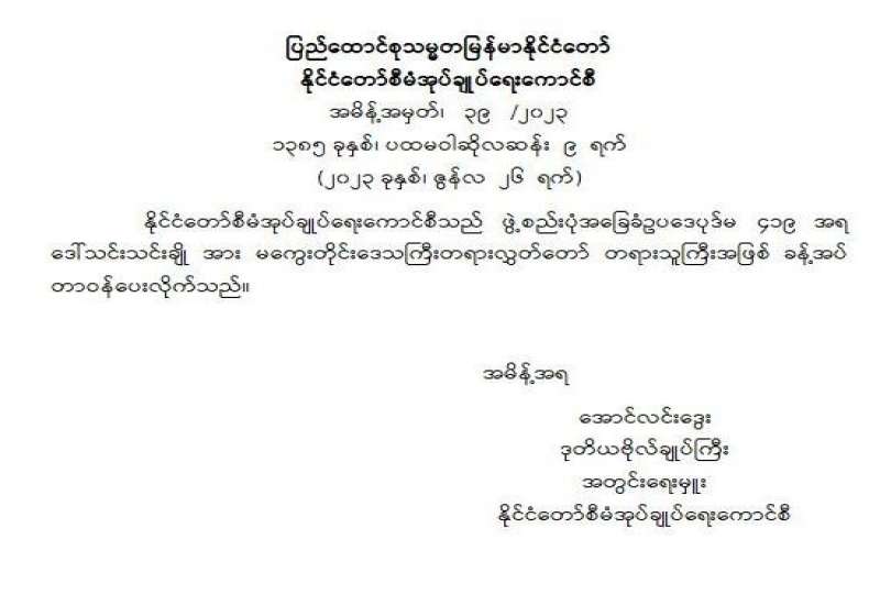နိုင်ငံတော်စီမံအုပ်ချုပ်ရေးကောင်စီ၏ ရှေ့လုပ်ငန်းစဉ် (၅) ရပ်အနက် ပထမအချက်တွင် “ပြည်သူတို့၏ လူမှုစီးပွားဘဝလုံခြုံရေးအတွက် ပြည်ထောင်စုတစ်ဝန်းလုံး တည်ငြိမ်အေးချမ်းရေးနှင့် တရားဥပဒေစိုးမိုးရေး အပြည့်အဝရရှိစေရန် အလေးထားလုပ်ဆောင်မည်” ဟု ချမှတ်ထားသည်။ ပြည်သူလူထုတစ်ရပ်လုံး၏ အဓိကလိုအပ်ချက်မှာ လူမှုဘဝတွင် လုံခြုံစိတ်ချစွာဖြင့် စိတ်အေးချမ်းစွာနေထိုင်နိုင်ပြီး စီးပွားဥစ္စာရှာဖွေစားသောက်နိုင်ရေးဖြစ်သည်။