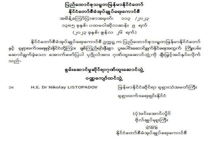 မြန်မာနိုင်ငံဆိုင်ရာ ရုရှားဖက်ဒရေးရှင်းနိုင်ငံသံအမတ်ကြီး ဒေါက်တာနီကိုလိုင်း လစ်စတိုပါဒေါ့ဗ်သည် မြန်မာနိုင်ငံရှိ ရုရှားဖက်ဒရေးရှင်းနိုင်ငံသံရုံးတွင် ၁၉၈၃ ခုနှစ်မှ ၁၉၈၆ ခုနှစ်အထိနှင့် ၁၉၉၀ ပြည့်နှစ်မှ ၁၉၉၄ ခုနှစ်အထိ တာဝန်ထမ်းခဲ့ပြီး မြန်မာနိုင်ငံဆိုင်ရာ ရုရှားဖက်ဒရေးရှင်းနိုင်ငံ သံအမတ်ကြီးအဖြစ် ၎င်း၏သံအမတ်ခန့်အပ်လွှာကို ၂၀၁၆ ခုနှစ်၊ အောက်တိုဘာလတွင် စတင်ပေးအပ်တာဝန်ထမ်းဆောင်ခဲ့ပါသည်။