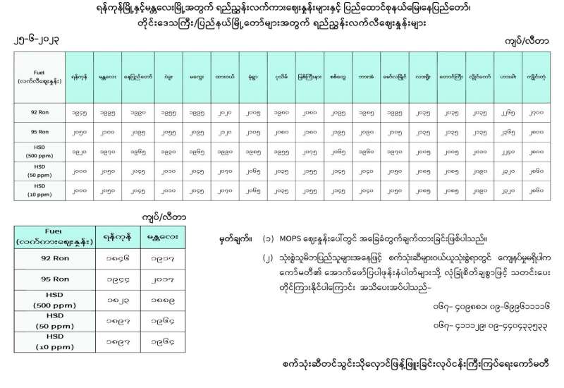 ရန်ကုန်မြို့နှင့် မန္တလေးမြို့အတွက် ရည်ညွှန်းလက်ကားဈေးနှုန်းများနှင့် ပြည်ထောင်စုနယ်မြေ နေပြည်တော်၊ တိုင်းဒေသကြီး/ပြည်နယ် မြို့တော်များအတွက် ရည်ညွှန်းလက်လီဈေးနှုန်းများ