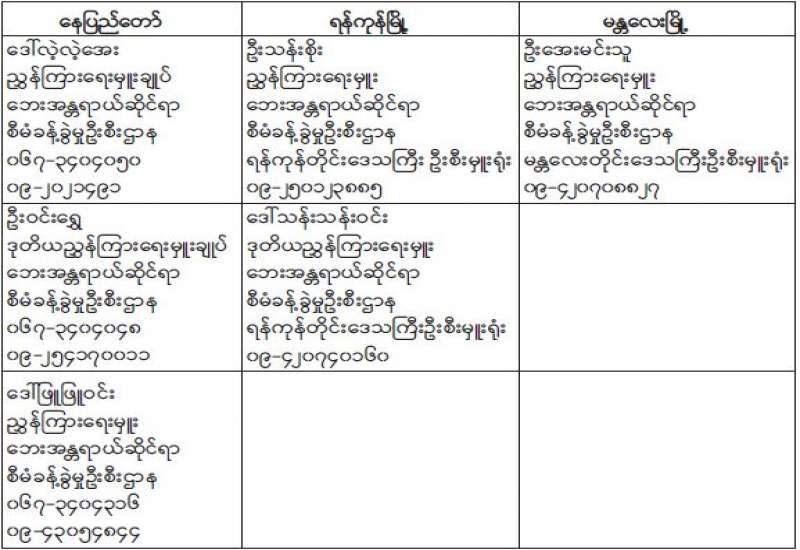 ပြည်ထောင်စုရွေးကောက်ပွဲကော်မရှင်သည် မှတ်ပုံတင်ခွင့်ပြုခဲ့ပြီးဖြစ်သော နိုင်ငံရေးပါတီများ၏ ပါတီလုပ်ငန်းများကို ဥပဒေ၊ နည်းဥပဒေများနှင့်အညီ လိုက်နာ ဆောင်ရွက်ခြင်းရှိ၊ မရှိ ကြီးကြပ်စစ်ဆေးမှုများ ဆောင်ရွက်လျက်ရှိရာ ပြည်ထောင်စုရွေးကောက်ပွဲကော်မရှင်အဖွဲ့ဝင် ဦးအောင်စောဝင်း၊ ဦးအောင်မိုးမြင့်၊ ဦးကိုကိုလွင်နှင့် ဦးသန်းအောင်ကျော်တို့သည် ယနေ့နံနက်ပိုင်းတွင် ရန်ကုန်မြို့ လွှတ်တော်အဆောက်အအုံရှိ ပယင်းခန်းမ၌ မြန်မာပြည်သူ့ ဒီမိုကရက်တစ်ပါတီ (MPD) ၊ ပြည်သူ့ရှေ့ဆောင်ပါတီ (People’s Pioneer Party)နှင့် အမျိုးသားနိုင်ငံရေးမဟာမိတ်များအဖွဲ့ချုပ်ပါတီတို့မှ ဥက္ကဋ္ဌ၊ အမှုဆောင်အဖွဲ့ဝင်များနှင့် တွေ့ဆုံသည်။
