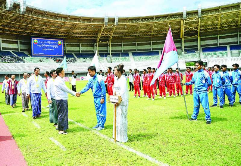 ၂၀၂၃ ခုနှစ် ဝန်ကြီးဌာနပေါင်းစုံ တက္ကသိုလ်များ ဘောလုံးပြိုင်ပွဲဖွင့်ပွဲအခမ်းအနားကို ယနေ့မွန်းလွဲ ၂ နာရီတွင် နေပြည်တော်ဝဏ္ဏသိဒ္ဓိ ဘောလုံးအားကစားကွင်း၌ကျင်းပရာ နိုင်ငံတော်စီမံအုပ်ချုပ်ရေးကောင်စီ အတွင်းရေးမှူး ဒုတိယဗိုလ်ချုပ်ကြီး အောင်လင်းဒွေး တက်ရောက်အားပေးသည်။