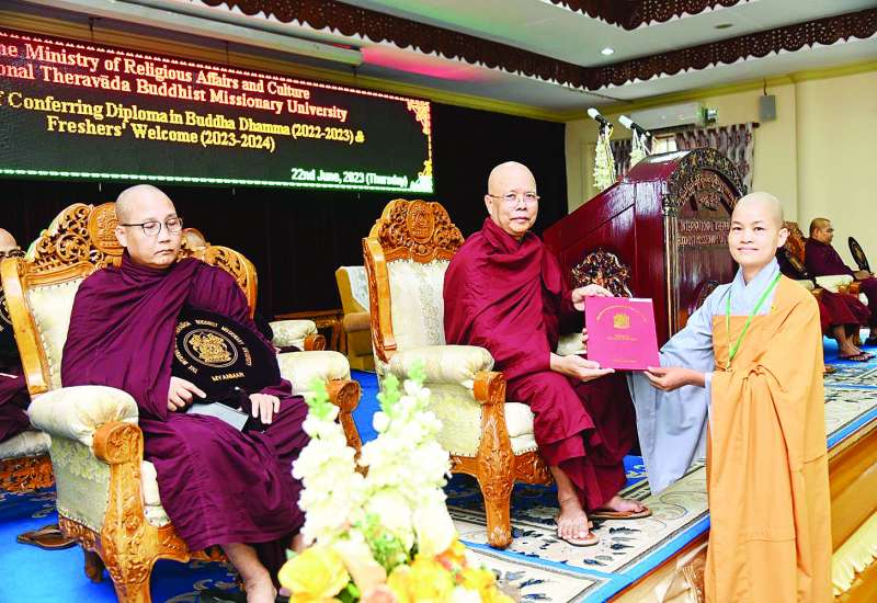 သာသနာရေးနှင့်ယဉ်ကျေးမှုဝန်ကြီးဌာန အပြည်ပြည်ဆိုင်ရာထေရဝါဒဗုဒ္ဓသာသနာပြု တက္ကသိုလ် ၂၀၂၂ - ၂၀၂၃ ပညာသင်နှစ်တွင် ဒီပလိုမာသင်တန်း အသီးသီးသို့ တက်ရောက်အောင်မြင်ခဲ့ကြသော ပြည်တွင်းပြည်ပသင်တန်းသားများအား ဒီပလိုမာ (ဗုဒ္ဓဓမ္မ) အောင်လက်မှတ်ချီးမြှင့်အပ်နှင်းပွဲနှင့် ၂၀၂၃ - ၂၀၂၄ ပညာသင်နှစ် သင်တန်းသားသစ် ကြိုဆိုပွဲအခမ်းအနားကို ယနေ့ နံနက် ၈ နာရီတွင် ရန်ကုန်တိုင်းဒေသကြီး မရမ်းကုန်းမြို့နယ် အပြည် ပြည်ဆိုင်ရာထေရဝါဒ ဗုဒ္ဓသာသနာပြုတက္ကသိုလ် Seminar Hall ၌ ကျင်းပပြုလုပ်သည်။