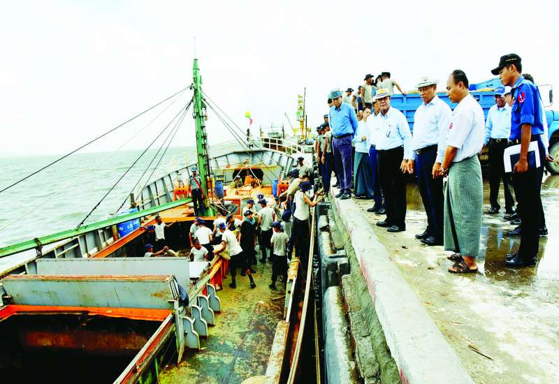 ရခိုင်ပြည်နယ်အတွင်း မုန်တိုင်းဒဏ်ကြောင့် ပျက်စီးဆုံးရှုံးမှုများ ပြန်လည်ထူထောင်ရေး လုပ်ငန်းများကို အနီးကပ်ကြီးကြပ်ကွပ်ကဲရန် စစ်တွေမြို့၌ ရောက်ရှိနေသော နိုင်ငံတော်စီမံအုပ်ချုပ်ရေးကောင်စီအဖွဲ့ဝင် ဒုတိယဝန်ကြီးချုပ်နှင့် ပြည်ထောင်စုဝန်ကြီး ဗိုလ်ချုပ်ကြီး တင်အောင်စန်းသည် ပြည်ထောင်စုဝန်ကြီးများဖြစ်ကြသည့် ဒုတိယဗိုလ်ချုပ်ကြီး ထွန်းထွန်းနောင်၊ ဦးလှမိုး၊ ဦးမျိုးသန့်နှင့် ဒေါက်တာသက်သက်ခိုင်၊ ဒုတိယဝန်ကြီးများ၊ တာဝန်ရှိသူများနှင့်အတူ ယနေ့တွင် ဘုန်းတော်ကြီးကျောင်း၊ ခရစ်ယာန်ဘုရားရှိခိုးကျောင်းနှင့် ဟိန္ဒူဘုရားကျောင်းများပြုပြင်ရေး အလှူငွေပေးအပ်ခြင်းနှင့် ဘိုးဘွားရိပ်သာများနှင့် လူငယ်ဖွံ့ဖြိုးရေး ပရဟိတဂေဟာများသို့ ထောက်ပံ့ငွေများပေးအပ်ခြင်း အခမ်းအနားသို့ တက်ရောက်ပြီး စစ်တွေမြို့ဘက်စုံသုံးဆိပ်ကမ်းနှင့် မြန်မာ့ဆိပ်ကမ်းအာဏာပိုင် ဖောင်တော်ကြီးဆိပ်ခံတံတား၌ ဆိုက်ကပ်ထားသည့် သင်္ဘောများပေါ်မှ ကူညီကယ်ဆယ်ရေးနှင့် ပြန်လည်ထူထောင်ရေး လုပ်ငန်းများတွင် အသုံးပြုမည့်ပစ္စည်းများ ဘေးသင့်ဒေသများသို့ ဖြန့်ခွဲပေးနိုင်ရေး စီမံဆောင်ရွက်နေမှုများကို ကြည့်ရှုစစ်ဆေးသည်။