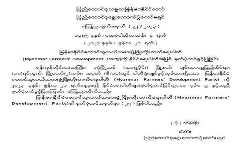 မြန်မာနိုင်ငံတောင်သူလယ်သမားဖွံ့ဖြိုးတိုးတက်ရေးပါတီ(Myanmar Farmers’ Development Party) ကို နိုင်ငံရေးပါတီအဖြစ် မှတ်ပုံတင်ခွင့်ပြုခြင်း