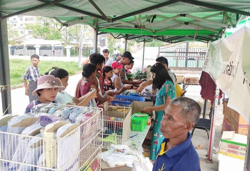 ဆိုင်ကလုန်းမုန်တိုင်း (မိုခါ) တိုက်ခတ်မှုကြောင့် ပျက်စီးမှုများဖြစ်ပေါ်ခဲ့သည့် စစ်တွေမြို့ရှိ မုန်တိုင်းဒဏ်သင့်ဒေသခံပြည်သူများနှင့် ဌာနဆိုင်ရာဝန်ထမ်းများ၏ စားသောက်ရေး အဆင်ပြေစေရန်နှင့် မိမိတို့အလိုရှိရာ စားသောက်ကုန်ပစ္စည်းများကို ဈေးနှုန်းသက်သာစွာဖြင့် ဝယ်ယူစားသောက်နိုင်ရေးအတွက် အနောက်ပိုင်းတိုင်းစစ်ဌာနချုပ်၊ နယ်မြေခံတပ်မတော်သားများနှင့် တာဝန်ရှိသူများက နေ့စဉ်ရောင်းချပေးလျက်ရှိသည်။