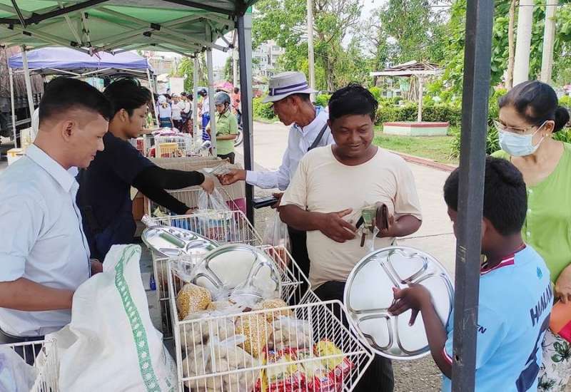 ဆိုင်ကလုန်းမုန်တိုင်း(မိုခါ)တိုက်ခတ်မှုကြောင့် ပျက်စီးမှုများဖြစ်ပေါ်ခဲ့သည့် စစ်တွေမြို့ရှိ မုန်တိုင်းဒဏ်သင့် ဒေသခံပြည်သူများနှင့် ဌာနဆိုင်ရာဝန်ထမ်းများ၏ စားသောက်ရေး အဆင်ပြေစေရန်နှင့် မိမိတို့အလိုရှိရာ စားသောက်ကုန်ပစ္စည်းများကို ဈေးနှုန်းသက်သာစွာဖြင့် ဝယ်ယူစားသောက်နိုင်ရေးအတွက် အနောက်ပိုင်းတိုင်းစစ်ဌာနချုပ်၊ နယ်မြေခံတပ်မတော်သားများနှင့် တာဝန်ရှိသူများက နေ့စဉ်ရောင်းချပေးလျက်ရှိသည်။