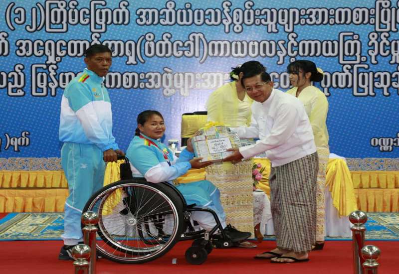ကမ္ဘောဒီးယားနိုင်ငံ၌ ကျင်းပသည့် (၁၂)ကြိမ်မြောက် အာဆီယံမသန်စွမ်းသူများ အားကစားပြိုင်ပွဲနှင့် အင်ဒိုနီးရှားနိုင်ငံ၌ကျင်းပသည့် (၁၇)ကြိမ်မြောက် အရှေ့တောင် အာရှ(ဖိတ်ခေါ်) ကာယဗလနှင့် ကာယကြံ့ခိုင်မှု အားကစားပြိုင်ပွဲတို့တွင် ဆုတံဆိပ်ရရှိခဲ့သည့် မြန်မာအားကစားအဖွဲ့များအား နိုင်ငံတော်မှဂုဏ်ပြုဆု ချီးမြှင့်ခြင်းအခမ်းအနားကို ယနေ့မွန်းလွဲပိုင်းတွင် နေပြည်တော်ရှိ ဝဏ္ဏသိဒ္ဓိ အားကစားရုံ(B)၌ကျင်းပရာ နိုင်ငံတော်စီမံအုပ်ချုပ်ရေးကောင်စီဥက္ကဋ္ဌ နိုင်ငံတော်ဝန်ကြီးချုပ် ဗိုလ်ချုပ်မှူးကြီး မင်းအောင်လှိုင် တက်ရောက်အမှာစကားပြောကြားပြီး ဂုဏ်ပြုဆုငွေများ ပေးအပ် ချီးမြှင့်သည်။