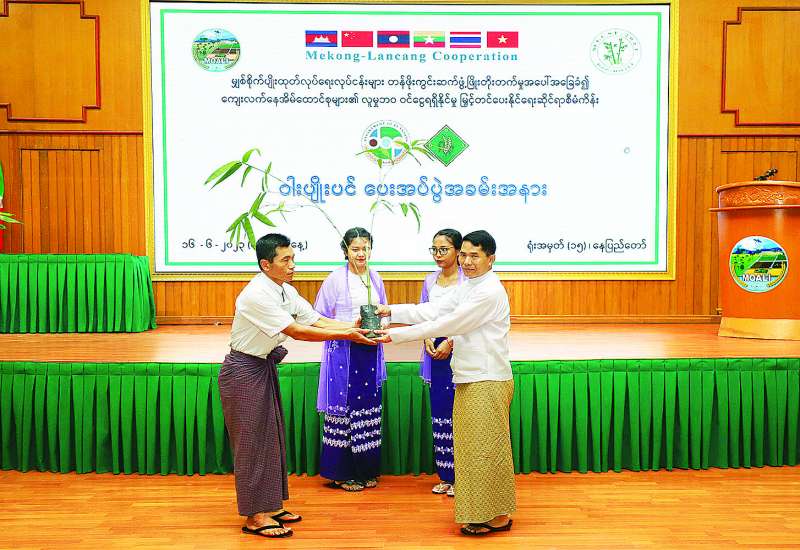 စိုက်ပျိုးရေး၊ မွေးမြူရေးနှင့်ဆည်မြောင်းဝန်ကြီးဌာန စီမံကိန်းဦးစီးဌာနက မဲခေါင်-လန်ချန်းပူးပေါင်းဆောင်ရွက်မှု အထူးရန်ပုံငွေ(၂၀၂၁)ဖြင့် အကောင် အထည်ဖော်ဆောင်ရွက်လျက်ရှိသော “မျှစ်စိုက်ပျိုး ထုတ်လုပ်ရေးတန်ဖိုးကွင်းဆက် ဖွံ့ဖြိုးတိုးတက်မှု အပေါ်အခြေခံ၍ကျေးလက်နေအိမ်ထောင်စုများ၏ လူမှုဘဝဝင်ငွေရရှိနိုင်မှုမြှင့်တင်ပေးနိုင်ရေးဆိုင်ရာ စီမံကိန်း” ၏ “ဝါးပျိုးပင်ပေးအပ်ပွဲအခမ်းအနား” ကို ယနေ့နံနက်ပိုင်းတွင်အဆိုပါဝန်ကြီးဌာနစုဝေးဆောင်ခန်းမ၌ ကျင်းပသည်။