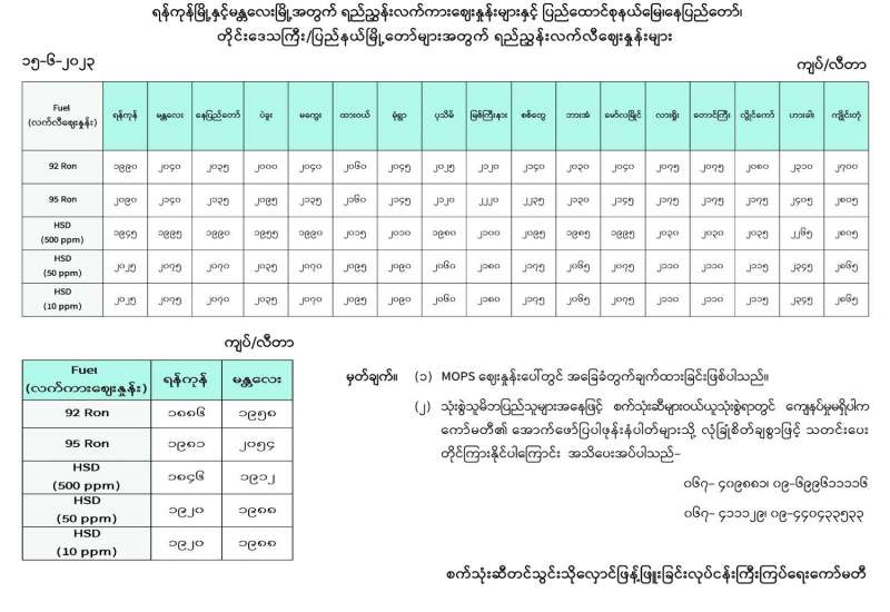 ရန်ကုန်မြို့နှင့် မန္တလေးမြို့အတွက် ရည်ညွှန်းလက်ကားဈေးနှုန်းများနှင့် ပြည်ထောင်စုနယ်မြေ နေပြည်တော်၊ တိုင်းဒေသကြီး/ပြည်နယ် မြို့တော်များအတွက် ရည်ညွှန်းလက်လီဈေးနှုန်းများ