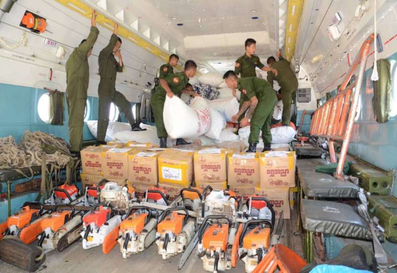 တပ်မတော်(လေ)အနေဖြင့် သဘာဝဘေးဒဏ်သင့်ဒေသများသို့ တပ်မတော် (ကြည်း၊ ရေ၊ လေ) မိသားစုများ၊ စေတနာရှင်အလှူရှင်များက လှူဒါန်းသည့် စားသောက်ဖွယ်ရာများ၊ ကူညီထောက်ပံ့ရေးပစ္စည်းများ၊ အမျိုးသားသဘာဝဘေးအန္တရာယ်ဆိုင်ရာ စီမံခန့်ခွဲမှု ကော်မတီက ထောက်ပံ့ပေးအပ်သည့် ပစ္စည်းများကို တပ်မတော်လေယာဉ်၊ ရဟတ်ယာဉ်များဖြင့် ကူညီပို့ဆောင်ပေးလျက်ရှိသည်။